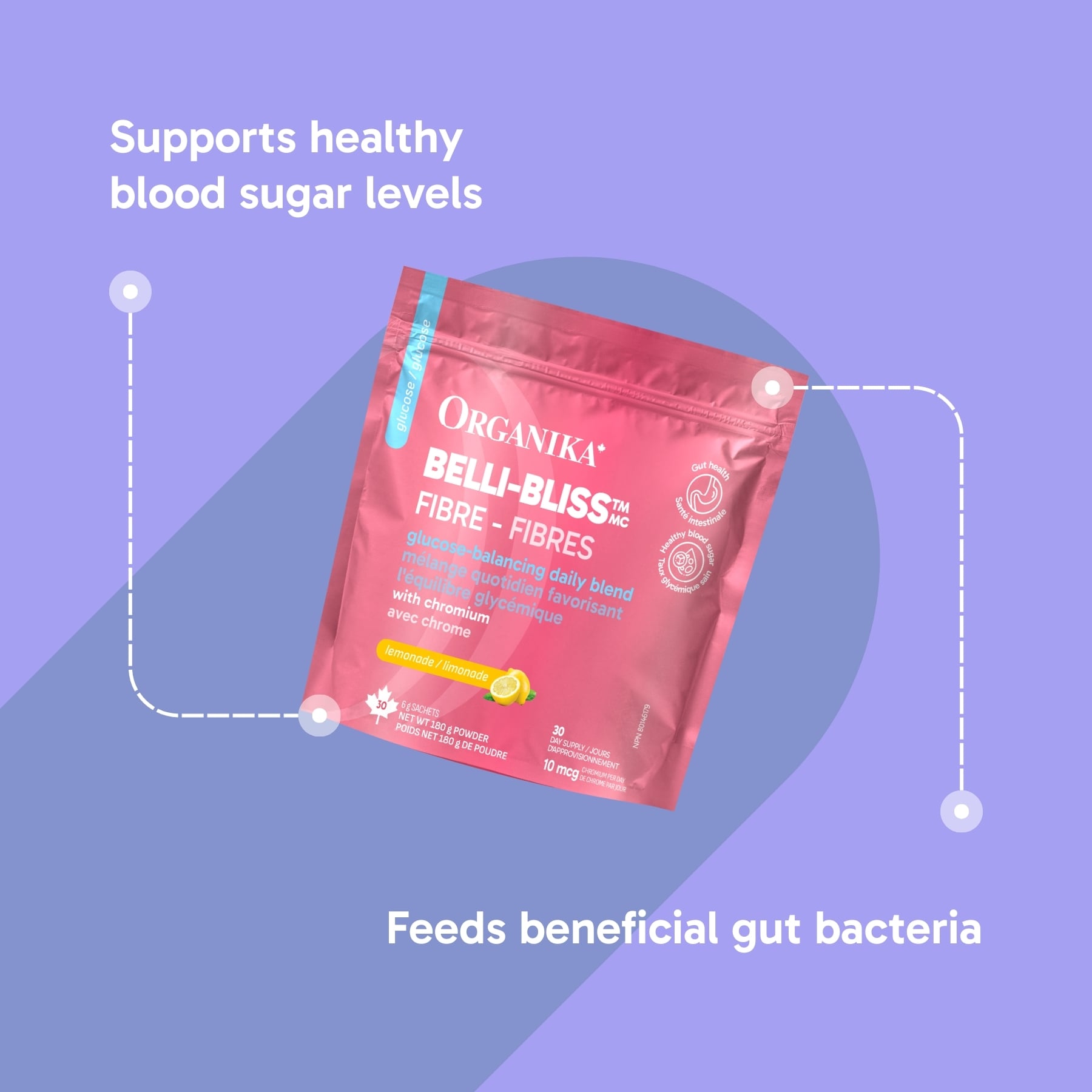 Belli-Bliss Glucose Fibre is a convenient, once-daily sachet designed to support steady blood sugar levels, gut health, and digestive regularity in one convenient sachet. Each serving delivers 4 g of fibre from two clinically studied sources—inulin and Fibersol®—plus chromium to support normal glucose metabolism.