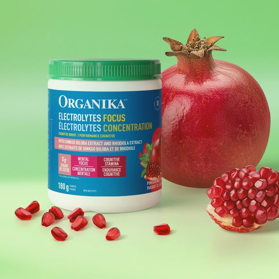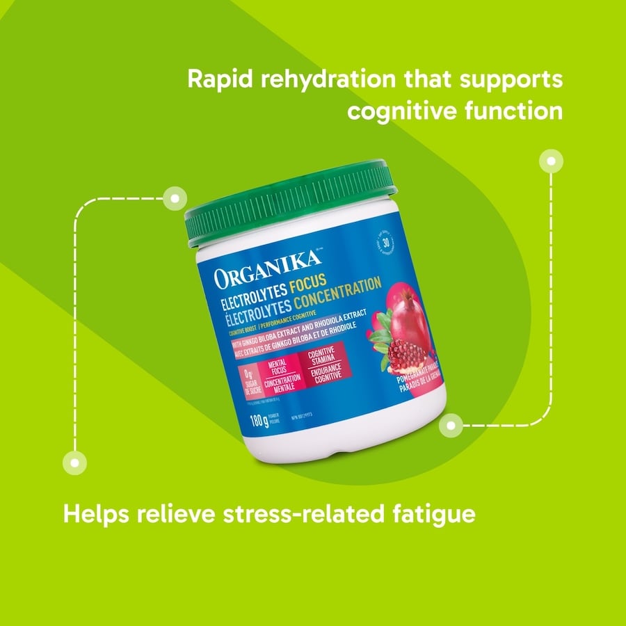Les produits Electrolyte Focus soutiennent la fonction cognitive et la concentration mentale grâce au Ginkgo Biloba, au Ginseng, à la L-Tyrosine et à la Rhodiola.