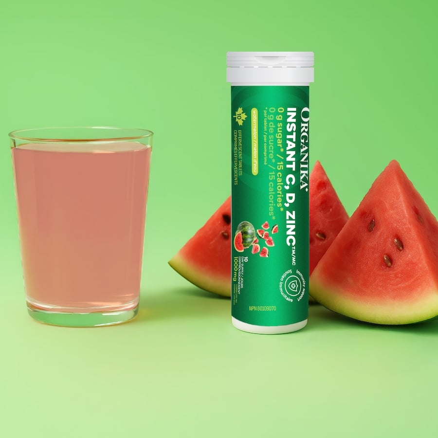 Instant C (orange, framboise et pêche-mangue) contient uniquement de la vitamine C, tandis qu'Instant C Immunité ajoute du zinc et de la vitamine D.