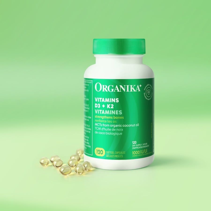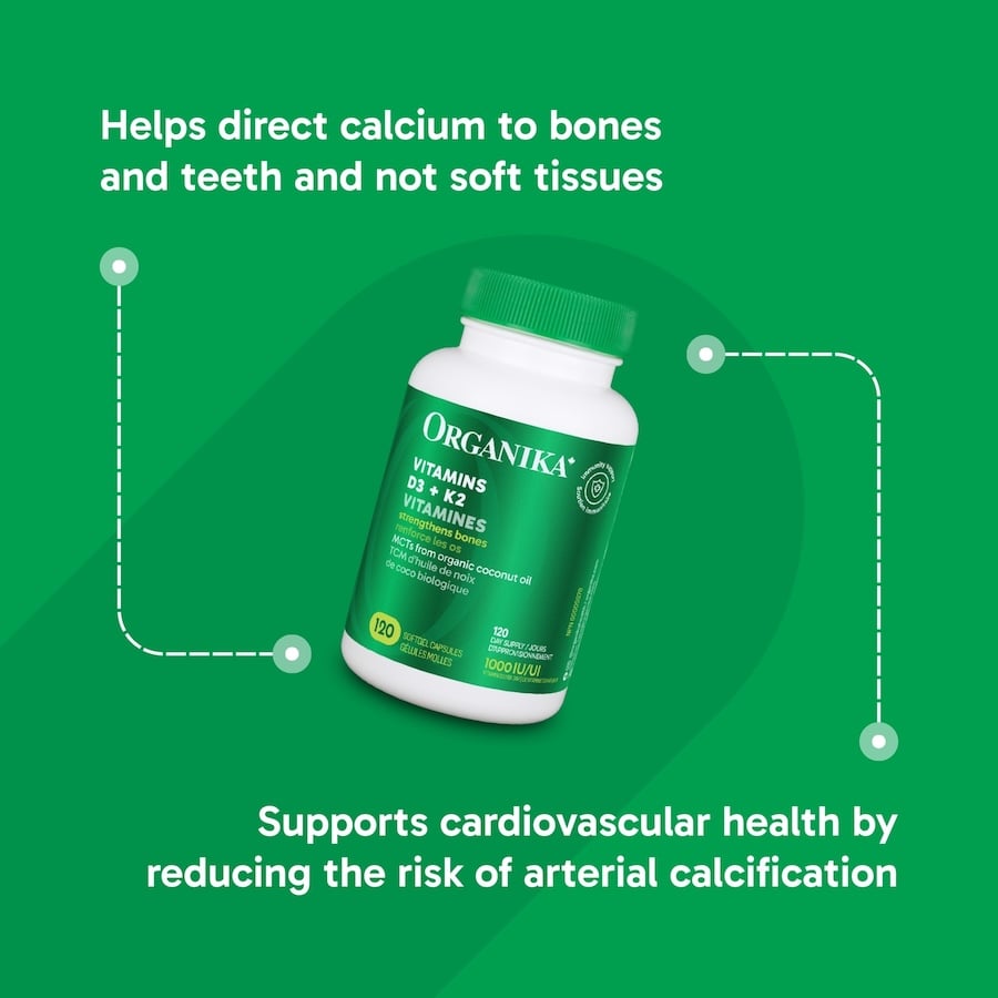Santé osseuse : La vitamine D3 favorise l'absorption du calcium, tandis que la vitamine K2 dirige le calcium vers les os et les dents, l'empêchant ainsi de se déposer dans les artères.