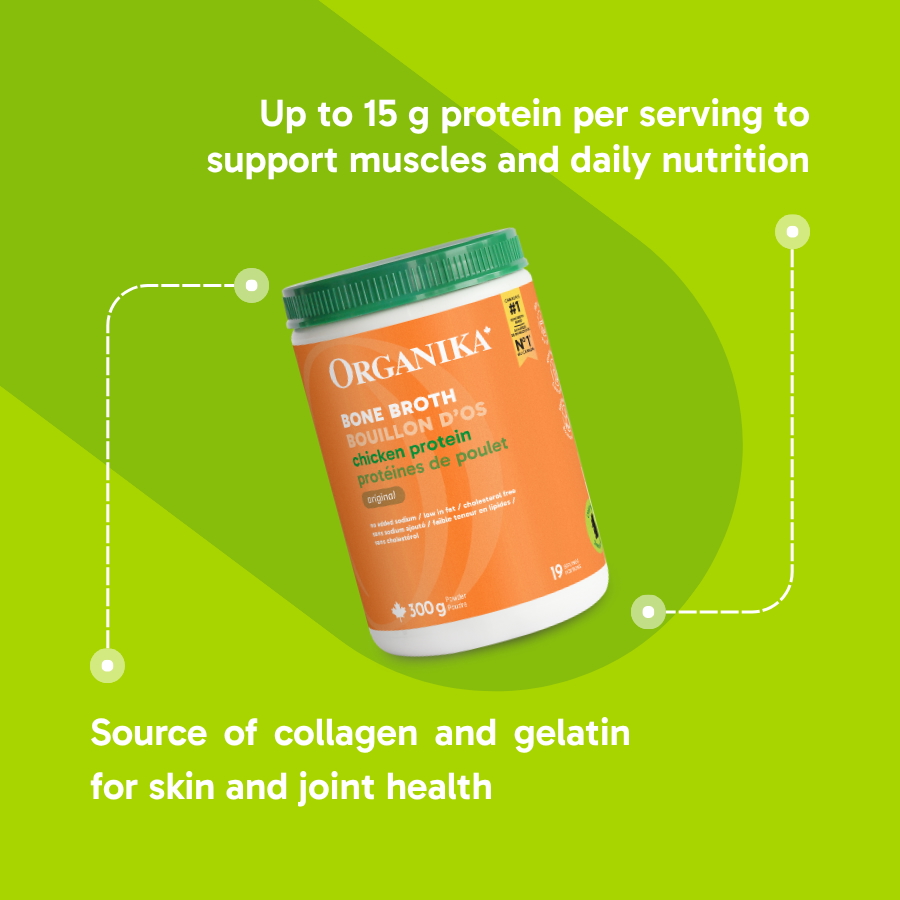 7 Reasons to start sipping on bone broth You may have heard about the plentiful benefits of bone broth, or that it is a highly nutritious source of protein, or that it is your ticket to gut health. Yes, to all the above. Bone broth is so much more than a comforting soup. It is a versatile accompaniment to recipes and the start to whole body health. If you have heard about it but are not sure if you should or need to have it in your pantry, let’s stir on that. What is bone broth? Bone broth is made by simmering animal bones and connective tissues for extended periods of time; typically made with cattle or chicken bones. Through the process of simmering, bones release beneficial nutrients such as collagen, gelatin, and amino acids (such as glycine, glutamine, and proline, to name a few). Alongside those nutrients are many key minerals, including protein, that aid tissue, gut, skin, and joint health. BONE BROTH NUTRITION FACTS Bone broth contains 19 easily absorbable amino acids, which are the building blocks of protein. Protein is the essential macronutrient needed in the body for cell regeneration. Not only does it help with muscle growth, but it also prevents muscle wasting and breakdown (which occurs naturally as you age). There is another incredible group of nutrients found in bone broth known as Glycosaminoglycans (GAGs). GAGs play a key role in building strong ligaments, cartilage, nails and skin firmness. Two of these includes glucosamine and chondroitin, both of which are well-studied natural compounds that help to decrease joint pain and inflammation. Bone broth also contains hyaluronic acid (another GAG) which helps with collagen production and helps to lubricate joints, tissues, including the skin and gut lining. 7 Bone broth benefits — Why you should drink it. Strengthens your joints and connective tissues As a natural source of collagen (type 1 for beef bone broth type 2 for chicken) bone broth helps to restore your connective tissues as well as repair joint health. A key component of bone broths is gelatin, which is the cooked form of collagen. Gelatin is easily digestible and provides protection from wear and tear to the joints. It’s also been shown to improve joint pain in people with osteoarthritis. Fights inflammation Amino acids such as glycine, glutamine and arginine, all found in bone broth, have all been considered to play a strong role in decreasing inflammation in the body. Arginine has been helpful in fighting ongoing inflammation, which can lead to several conditions and health concerns over time. This includes metabolic syndrome, heart disease and others. Glycine, a main amino acid in collagen, plays a role in producing an antioxidant that helps improve cell health and prevent inflammation (in the liver and gut). Glutamine has also been shown to block the production of nitric oxide which causes inflammation in the body. Together these amino acids in bone broth can provide your body with less pain by blocking inflammation. Helps heal your gut Because bone broth’s nutrient profile helps to decrease inflammation, it does that throughout the body including the digestive tract lining. Glycine improves the integrity of your digestive tract and plays a vital role in the absorption of nutrients found in our foods, potentially helping with several conditions. Because bone broth has collagen which supports tissue health, this also encourages strength in the tissues lining the gut, making it stronger and more resistant (no more “leaky gut”). Improves immunity There is a reason why warm broth or “chicken soup” has been touted as a remedy for cold and flus. Because of its immense nutrient profile, bone broth fights inflammation and supports gut health as you just read. In turn, when the digestive tract is healthy, it feeds to your overall health and boosts the immune system. Sipping bone broth has been linked to improving symptoms of respiratory tract infections, soothing sore throats and stomachs. Boosts skin health Collagen helps form elastin and other compounds within skin that are responsible for maintaining skin’s textures, buoyancy, elasticity and glow. Because of bone broth’s composition being rich in collagen, it’s no surprise that skin health is inevitably a big benefit. In addition, the hyaluronic acid component supports collagen production, as well as retains moisture within the skin tissues and its cells to provide a more “plump” appearance to the skin. Helps in detoxification Because bone broths (as we’ve seen) support your gut health, decreases liver inflammation and improves the body’s use of antioxidants, it also is helpful in supporting the body carry out toxins. In addition to potassium and glycine, both of which support cellular health, bone broth provides glutathione. This has been studied to help remove fat-soluble compounds and heavy metals from the body and increase the use of antioxidants to help your liver function better. Boosts metabolism Bone broth has a high protein amount (12g or more in Organika’s Chicken and Beef Broth Powders). The complete protein profile includes all the amino acids that help the body to repair muscle tissues, increase bone health, boost nutrient absorption and maintain tissue health everywhere. It also helps the body to convert its glucose stores into usable energy. Protein, specifically amino acids like glutamine, helps the body maintain energy and increase nutrient uptake by cells. These play key roles in increased metabolism and why you may find yourself feeling “satisfied” after sipping on a whole cup of bone broth. Bone broth made simple. Traditionally, bone broth is made by simmering animal bones for hours (sometimes days!) to extract every single nutrient from the bones. Organika has made it easier with powdered bone broths. Organika’s bone broth powders are extremely easy to use as well as digest. Simply add water or stir it into soups, sauces and more! Try these recipes featuri