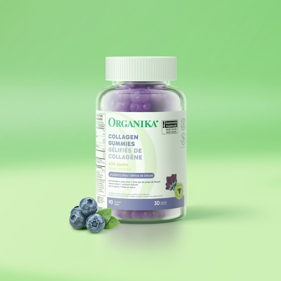 Nourish your skin, hair, nails and joints with targeted support for tissue strength and regeneration. Each 3-gummy serving delivers 2,500 mg of hydrolyzed bovine collagen and 210 mcg of biotin to support healthy hair growth and skin resilience. They're low in sugar, free from artificial colours and taste like real blueberries.