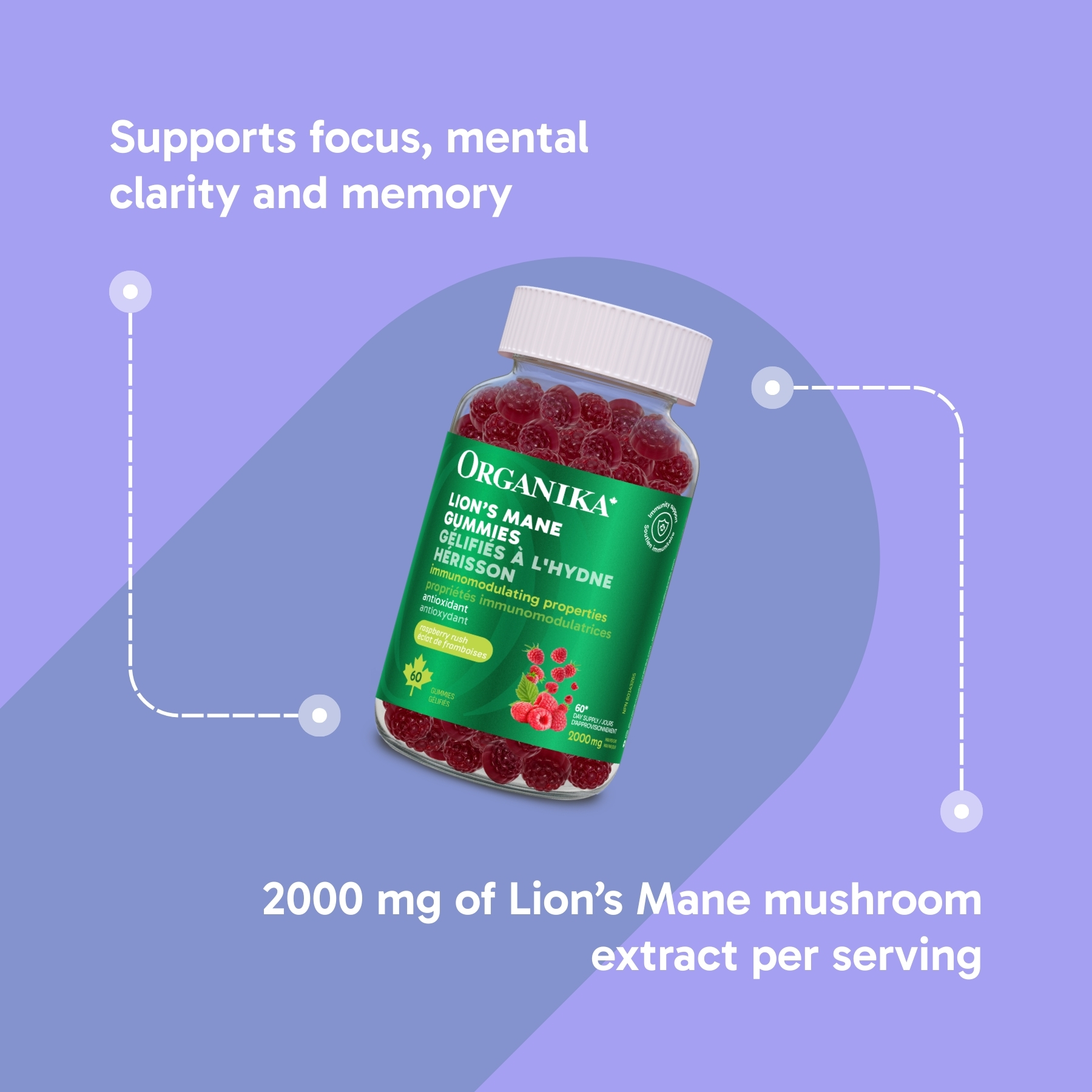 Delicious raspberry rush gummies packed with 2000 mg of lion’s mane to support focus, clarity and immune health