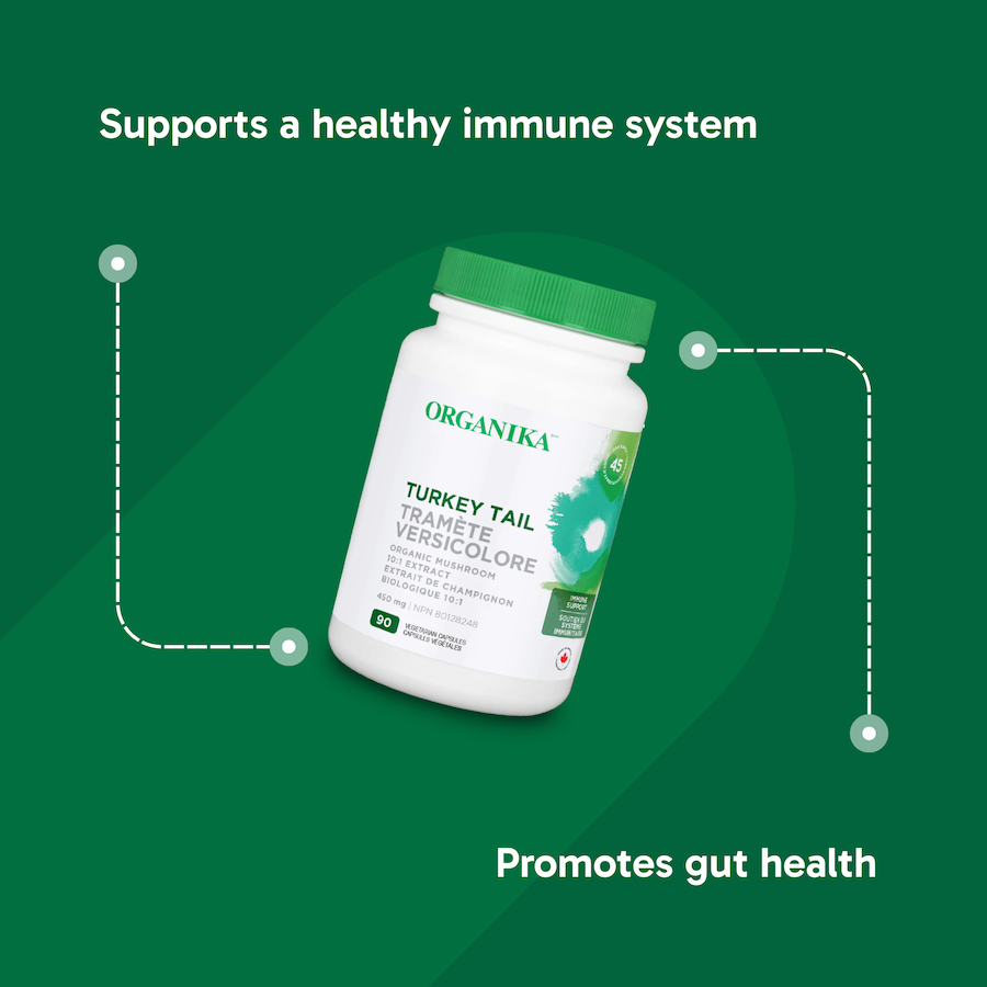 MEDICAL INGREDIENTS: Organic Turkey Tail Mushroom 10:1 Extract (Trametes versicolor, Fruiting Body) 450 mg (Equivalent to 4500 mg dried Turkey Tail fruiting body powder) (Standardized to contain 40% Polysaccharides).